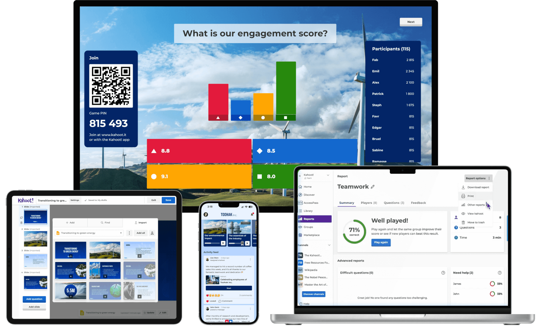 Analyze your return on engagement with access to organizational analytics through combined reports that show individual employee participation and progress across all your Kahoot! content. Export your data or seamlessly connect to your LMS with our reporting API.